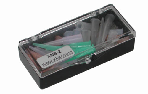 The XNS-2 (Set of 3-each of common dispensing needles and 3 syringe cups) is offered to help you select the required size. You can also order any Dispensing Needle size in packages of 25 or 100 pcs separately. (Example of P/N for 18 gauge tapered needle: for 50 pcs: XT-18-50 and for 250pcs: XT-18-250. To order different gauge just change 18 for required gauge size.). Dispensing tips are ideal for solder paste dispensing. Kit Includes: